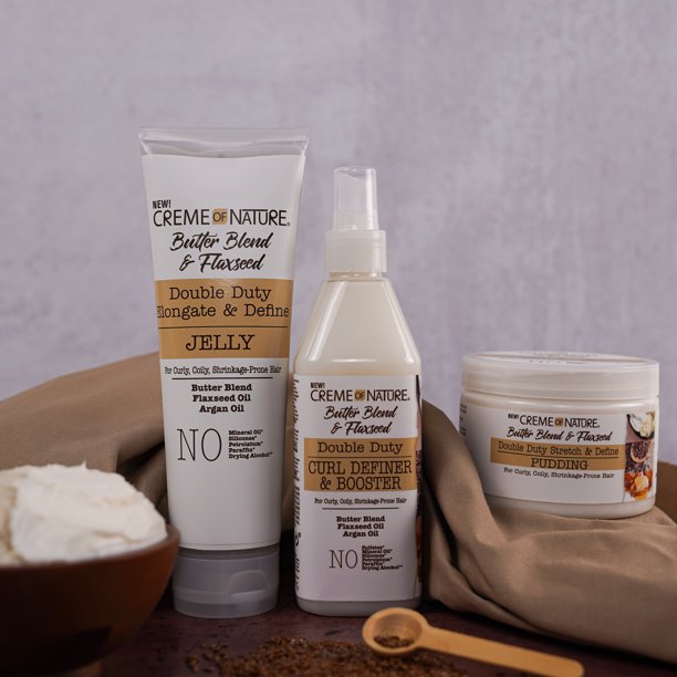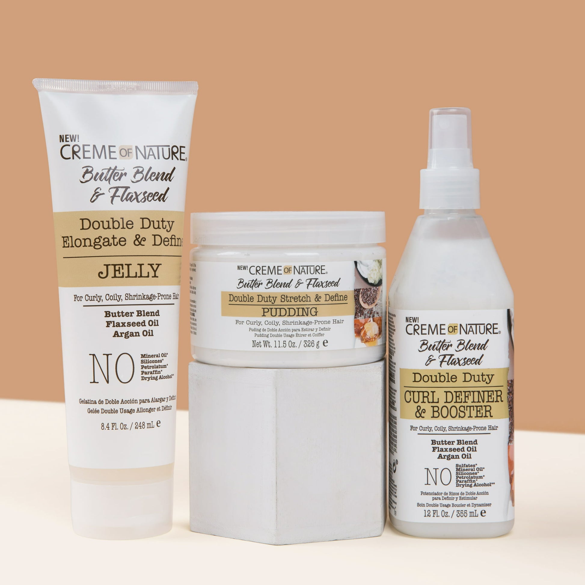 Creme of Nature Double Duty Butter Blend & Flaxseed Elongate & Define Jelly è arricchito con una miscela di burro, olio di semi di lino e puro olio di argan che fa risaltare i tuoi ricci! Questa Jelly per capelli ricci riduce al minimo il 'shrinkage' o il naturale restringimento dei ricci, definisce ricci inclini al 'shrinkage' e fornisce idratazione. Double Duty Elongate & Define Jelly, con la sua formula leggera, offre una tenuta e è perfetta per domare i capelli fuori posto e controllare l'effetto crespo."