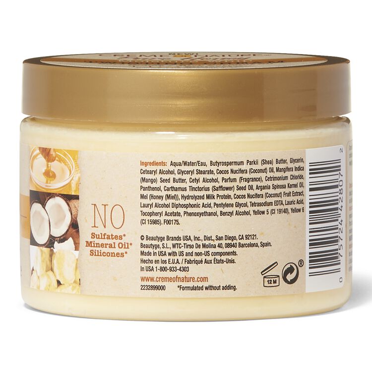 Aqua/Water/Eau, Butyrospermum Parkii (Shea) Butter, Glycerin, Cetearyl Alcohol, Glyceryl Stearate, Cocos Nucifera (Coconut) Oil, Mangifera Indica (Mango) Seed Butter, Cetyl Alcohol, Parfum (Fragrance), Cetrimonium Chloride, Panthenol, Carthamus Tinctorius (Safflower) Seed Oil, Argania Spinosa Kernel Oil, Mel (Honey (Miel)), Hydrolyzed Milk Protein, Cocos Nucifera (Coconut) Fruit Extract, Lauryl Alcohol Diphosphonic Acid, Pentylene Glycol, Tetrasodium EDTA, Lauric Acid, Tocopheryl Acetate, Phenoxyethanol, Benzyl Alcohol, Yellow 5 (CI 19140), Yellow 6 (CI 15985).